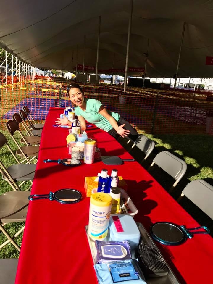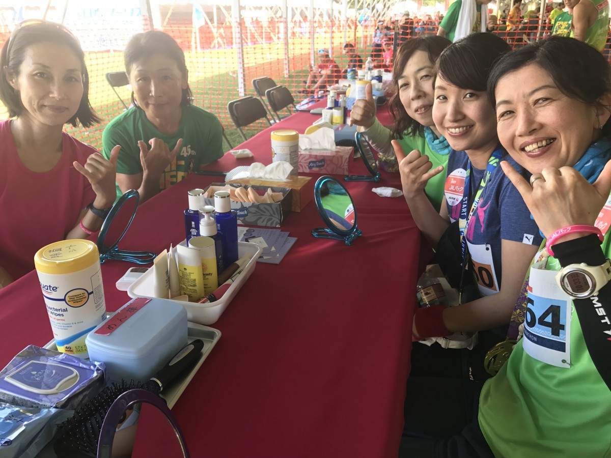 「レディーススペース」には、メイク直しのコスメ、日焼け止め、ティッシュやウェットティッシュなどを完備しておりますので、完走後の女性の皆さまがご活用下さいます。他のツアー会社さんにはないサービスです。2012年から設置させていただいておりますので、こうして続けさせていただけるのは、女性の参加者が年々増えている証拠ですね。